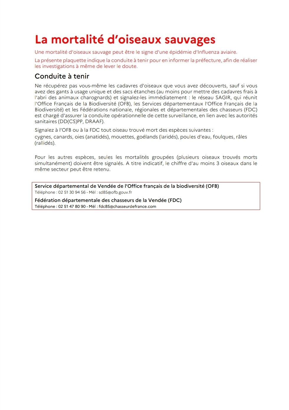 Enfin, concernant la découverte d'oiseaux sauvages morts, vous trouverez également en pièce jointe la procédure à suivre. (avec l'OFB ou la Fédération de Chasse)