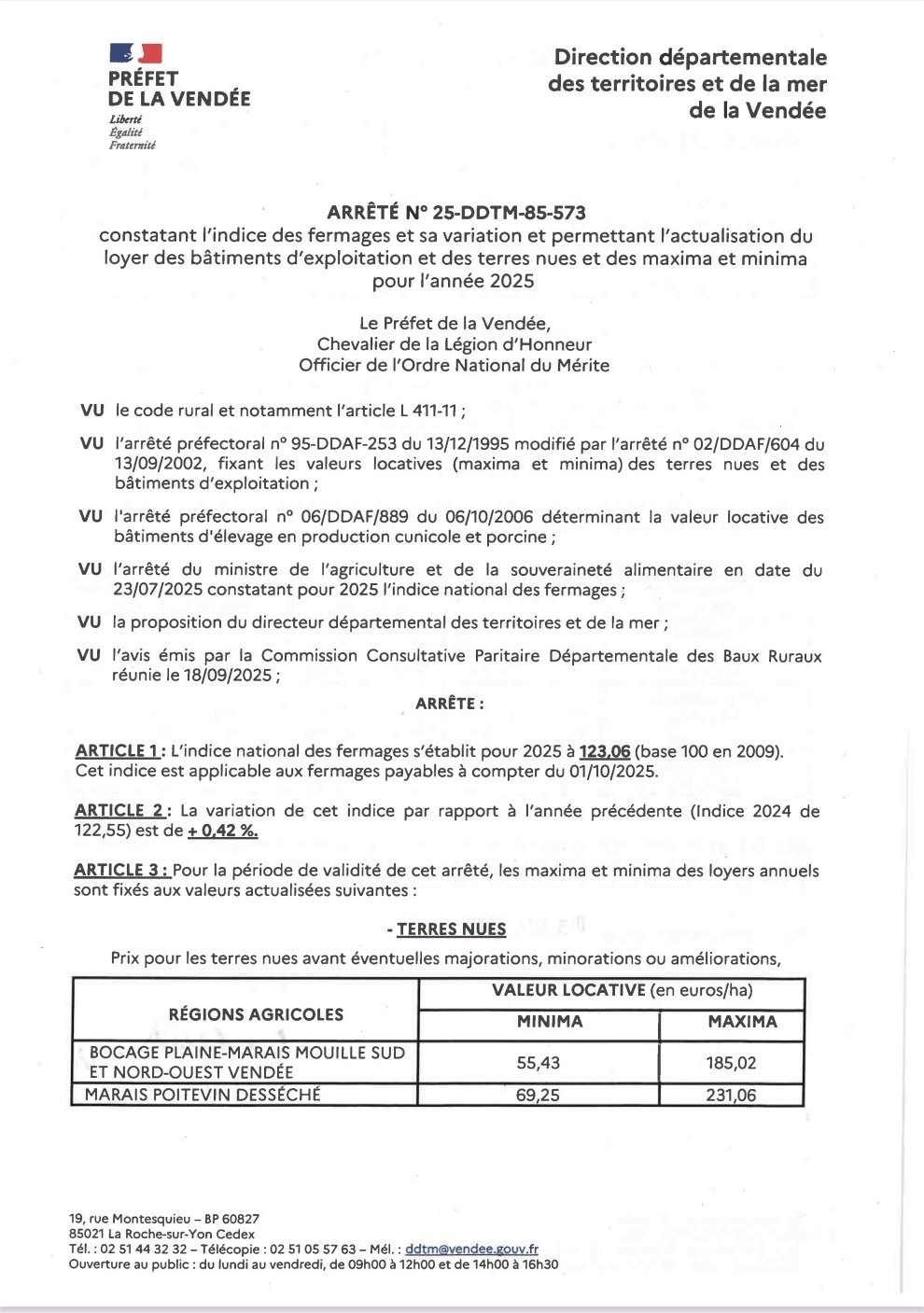 Vous trouverez ci-joint, l'arrêté constatant l'indice des fermages et sa variation pour l'année 2025.
