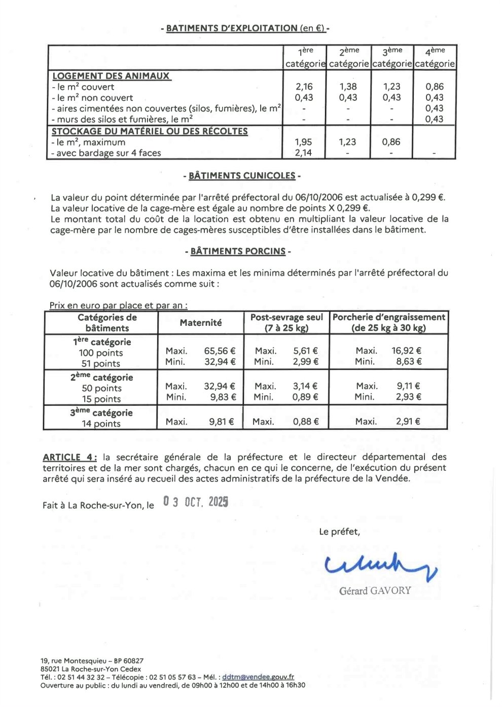 applique sa variation aux minima et maxima des loyers des bâtiments d'exploitation et des terres nues (par hectare et par an) pour la Vendée.