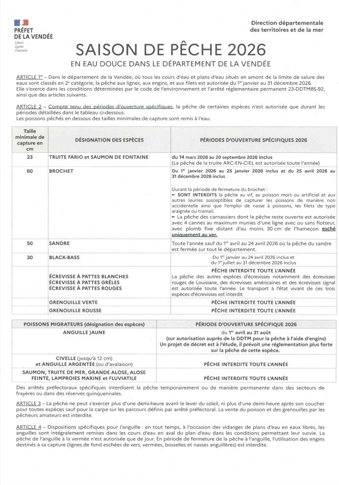 Veuillez trouver ci-joint, pour exécution, l'arrêté préfectoral n° 25-DDTM85-748 du 15 décembre 2025, fixant les périodes d'ouverture et de fermeture de la pêche en eau douce dans le département de la Vendée en 2026.