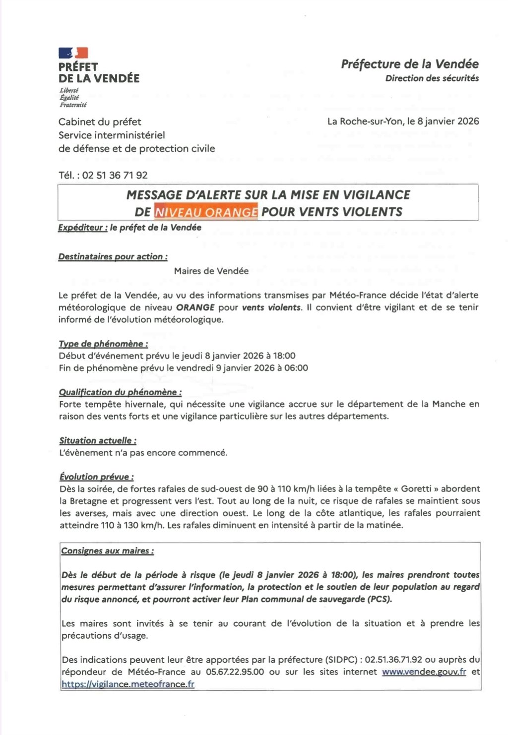 Vous trouverez en pièce jointe la mise en alerte météo "vents violents" de niveau orange, signée par Monsieur le Préfet de la Vendée.