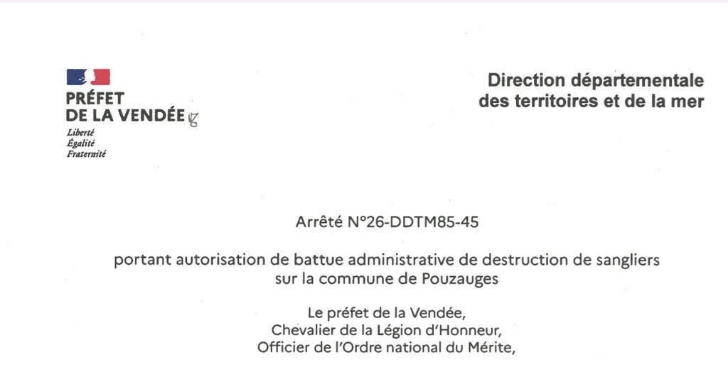 Suite à des risques pour la sécurité publique occasionnés par des sangliers, je vous prie de trouver en pièce-jointe, pour attribution, l'arrêté préfectoral 26-DDTM85-45 diligentant des battues administratives de destruction de cette espèce sur la commune de Pouzauges et les communes limitrophes.