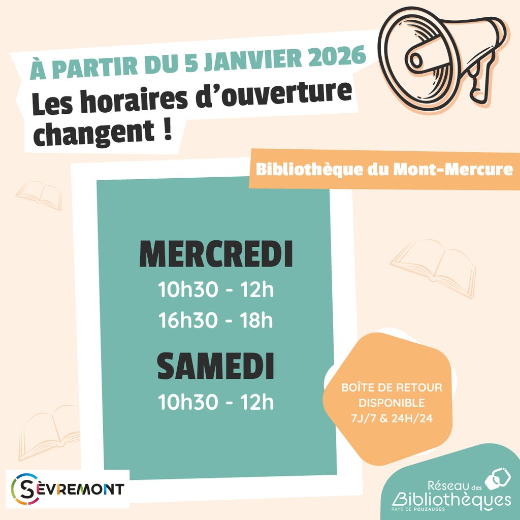 À partir du 5 janvier 2026, les horaires d'ouverture de la bibliothèque du Mont-Mercure changent !