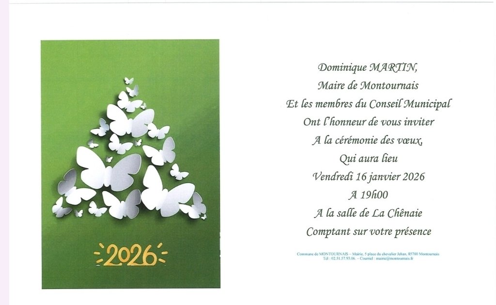 Vous êtes invités à la cérémonie des vœux du conseil municipal le 16 janvier à 19h00 à la salle de la Chênaie.