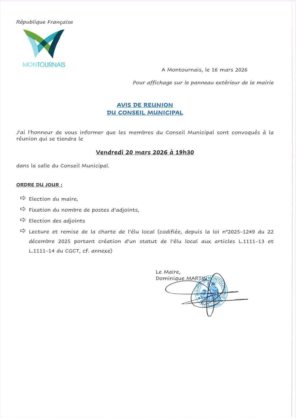 ORDRE DU JOUR DU CONSEIL MUNICIPAL DU 20 MARS 2026
