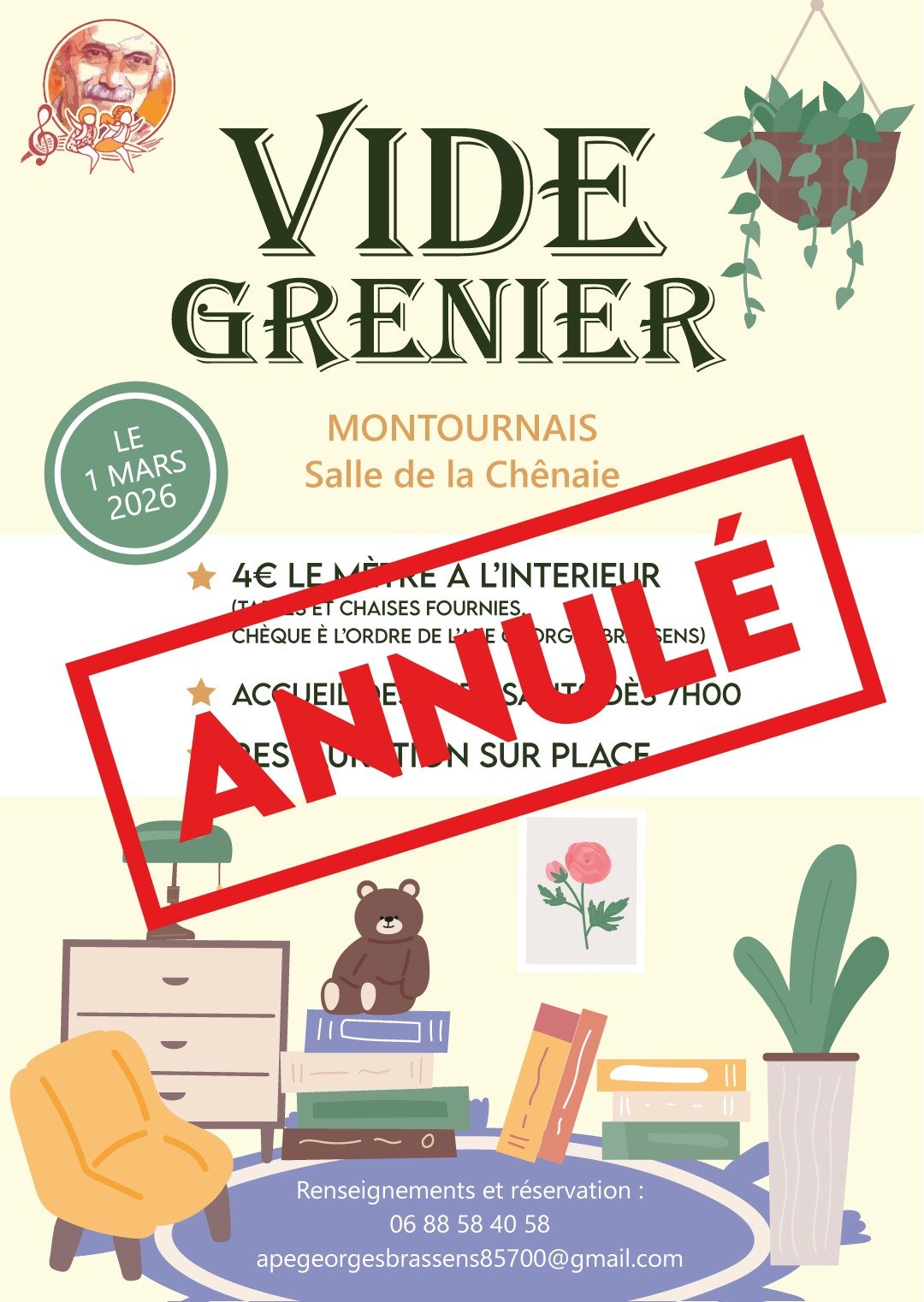 N'ayant pas assez de participants exposants, l'APE a pris la décision d'annuler le vide grenier prévu le 1er mars 2026 à la salle de la Chênaie.